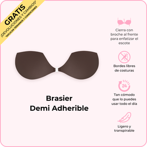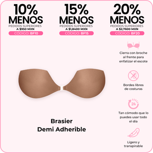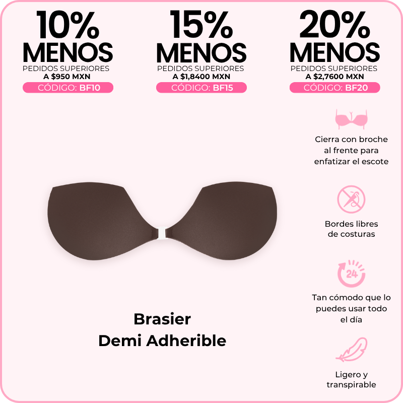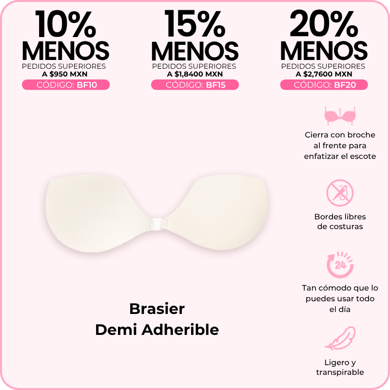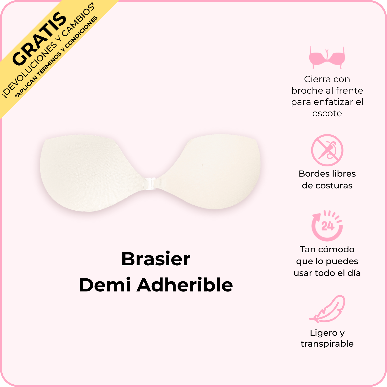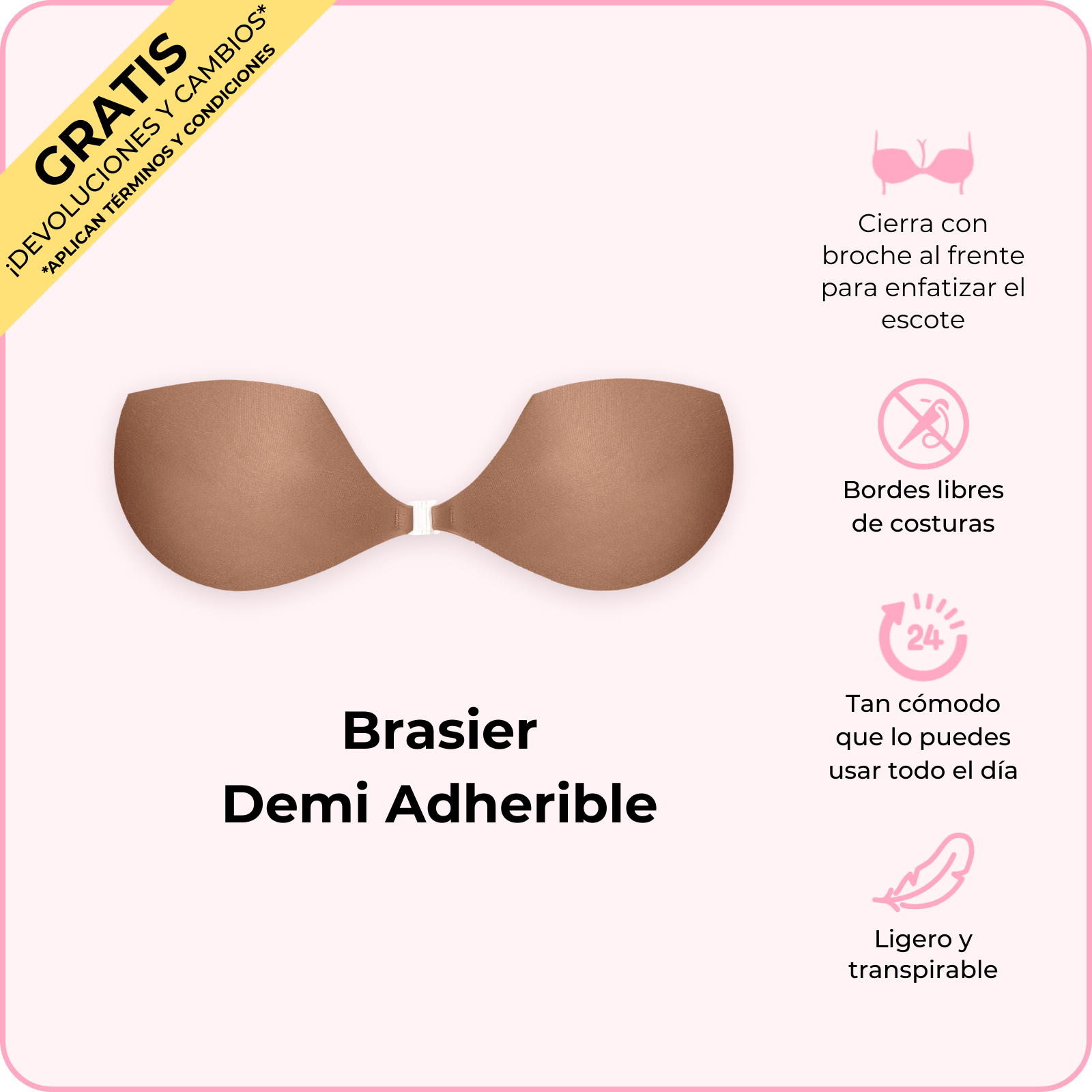 El Brasier Adherible Demi de BOOMBA tiene un diseño único y patentado. Las copas de nuestro Brasier Adherible Demi tienen un corte más bajo para asegurar que siempre se quede por debajo del escote de tu top. Las copas del brasier se amoldan a tus curvas naturales para brindarte un escote que se ve natural. Sus orillas libres de costuras también garantizan que se mantendrá liso bajo tu ropa para que no se distinga en tu atuendo.