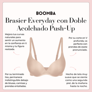 Te presentamos el brasier push-up perfecto: El Brasier Everyday con Doble Acolchado Push-Up de BOOMBA. Diseñado para levantar, dar forma y enfatizar, este brasier con doble acolchado te brinda tremendo escote y gran soporte, eso sin sacrificar la comodidad a lo largo del día. Con un corte profundo que es ideal para ponerte prendas con corte en V o de corte muy bajo, este es el brasier que te permitirá lucir el escote como siempre lo has soñado.
