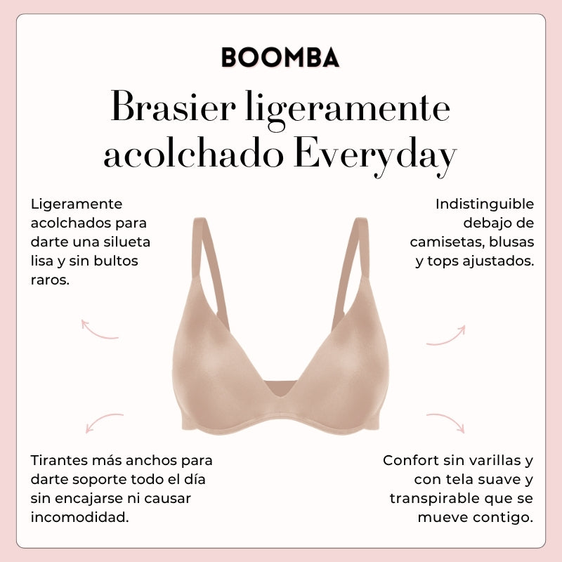 Descubre tu nueva prenda de diario: El Brasier Everyday de BOOMBA. Diseñado para sentirse como una segunda piel, este brasier sin varillas, ligeramente acolchado y con tirantes más anchos te brinda el equilibrio perfecto entre comodidad, forma y soporte. Este es el brasier que querrás ponerte todos los días y con todo.