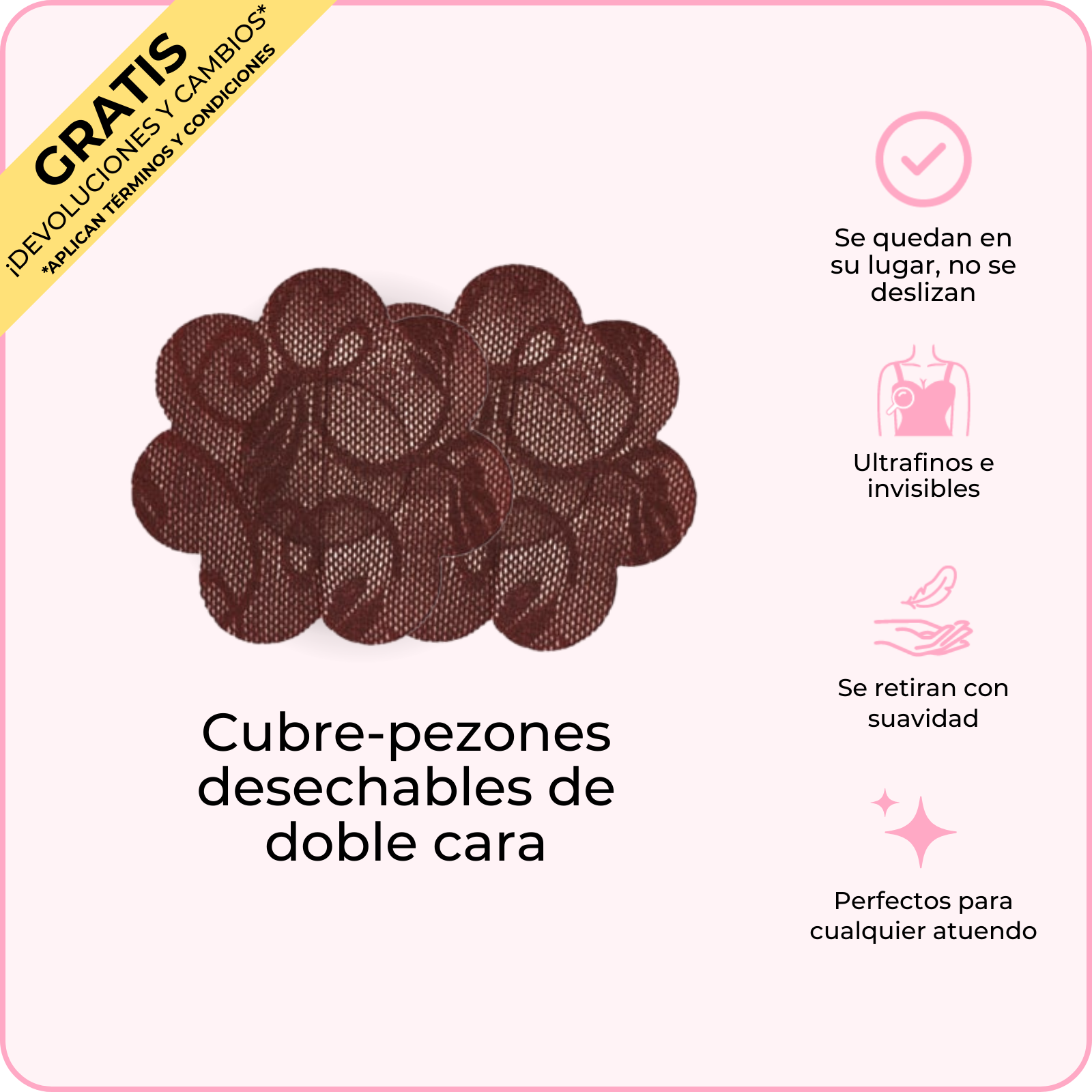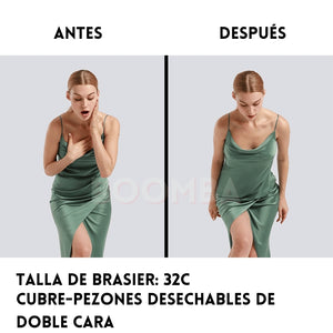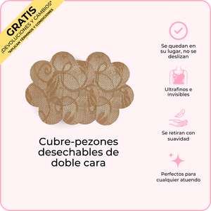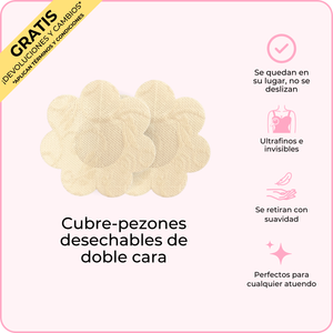 Los primeros Cubre-pezones desechables de doble cara del mundo, diseñados para que un lado se adhiera a tu ropa y el otro a ti. Evitan que tus pezones se asomen a la vez que se mantienen indetectables debajo de tu ropa.