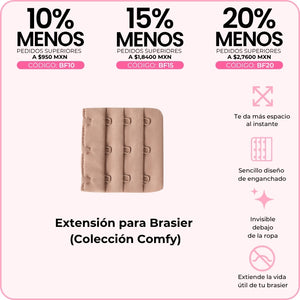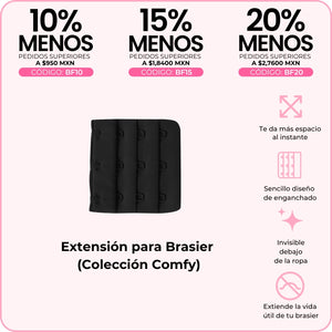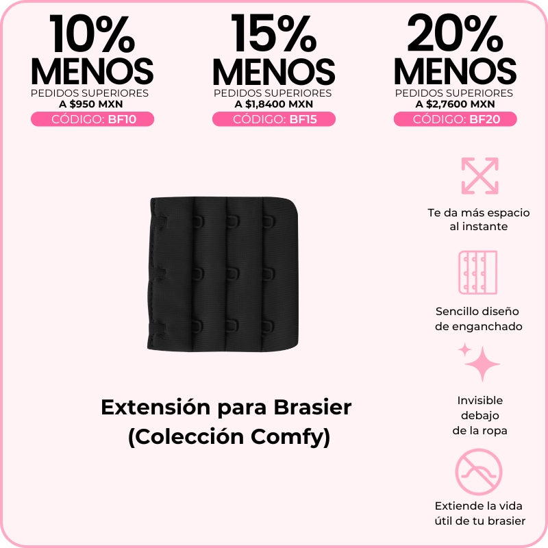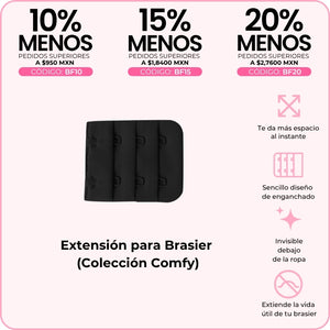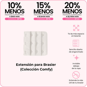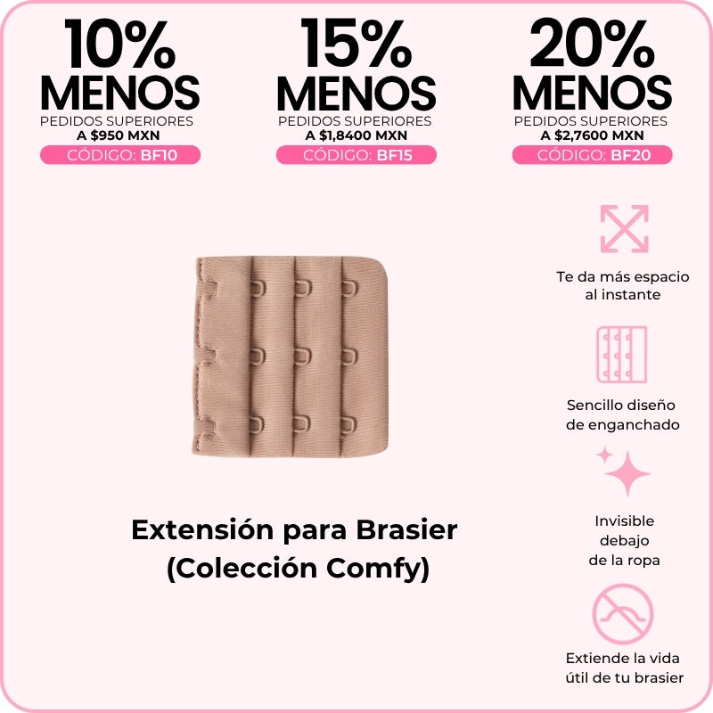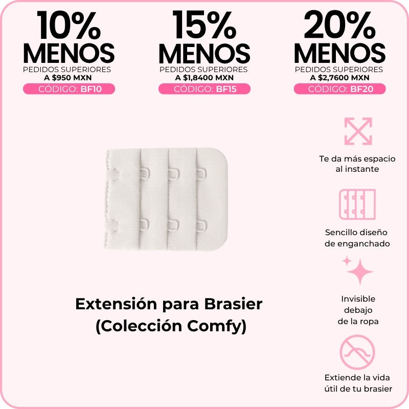No se trata de conformarse con brasieres que no te queden bien, sino de que tu colección de brasieres te trate mejor, sin importar qué haya cambiado. Con su suave y flexible diseño, se engancha fácilmente a tus Brasieres Comfy y los de Maternidad, dándote esos centímetros extra de comodidad, pero sin afectar el soporte que te brindan. Es perfecta para madres en lactancia que necesiten ir haciendo ajustes para estar comodas durante esta importante fase. Además, no se va a notar que la traes puesta debajo de tu ropa.