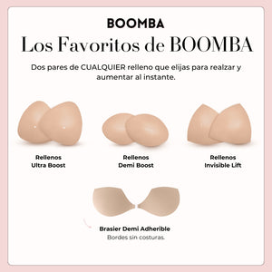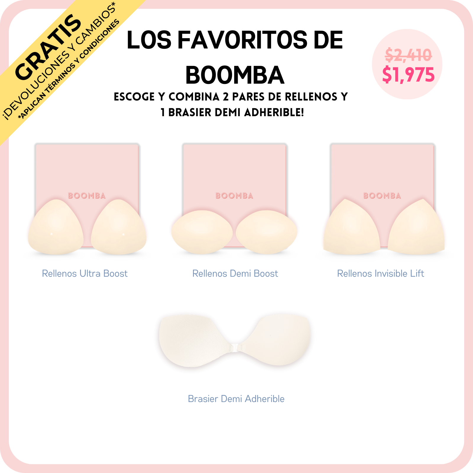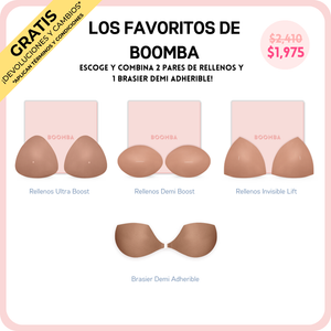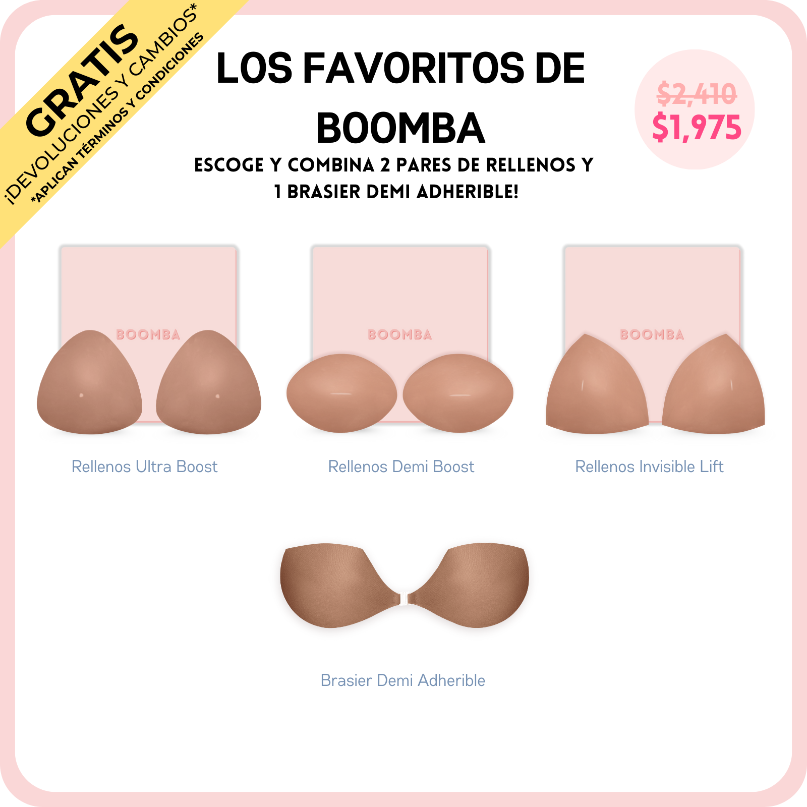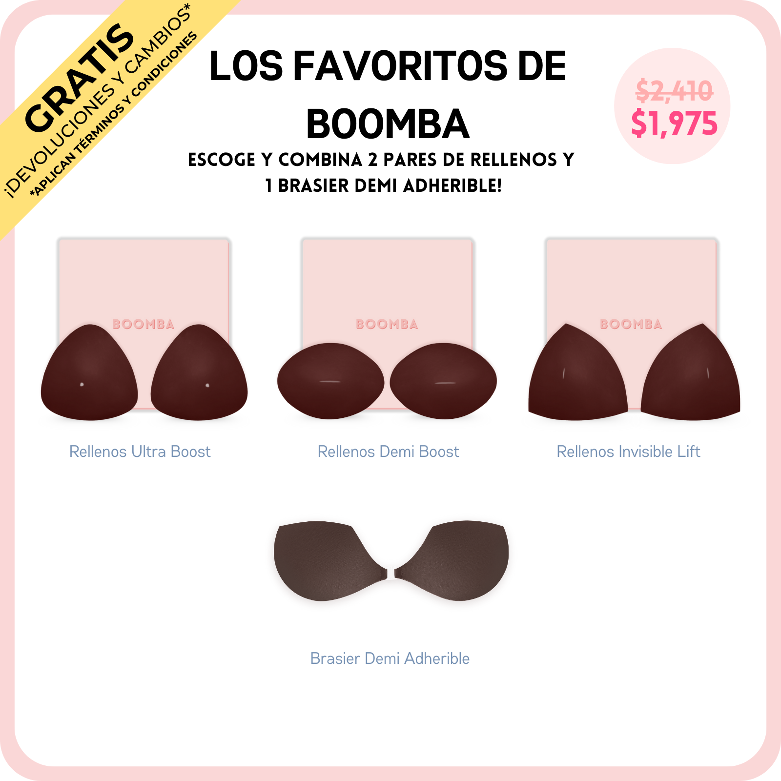Este paquete contiene 2 de nuestros rellenos más vendidos que tú elijas y el Brasier Adherible Demi BOOMBA. Elegidos personalmente como nuestros preferidos, este paquete contiene todo lo indispensable que necesitas para verte increíble y sentirte increíble en cualquier ocasión.