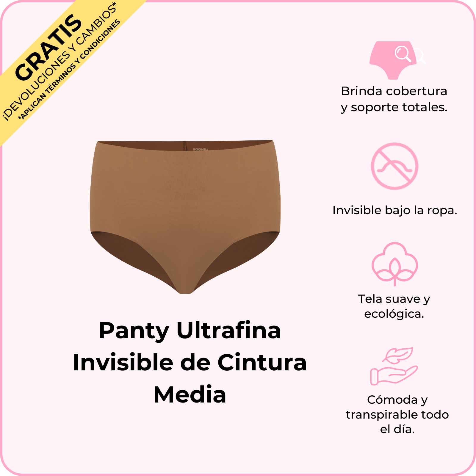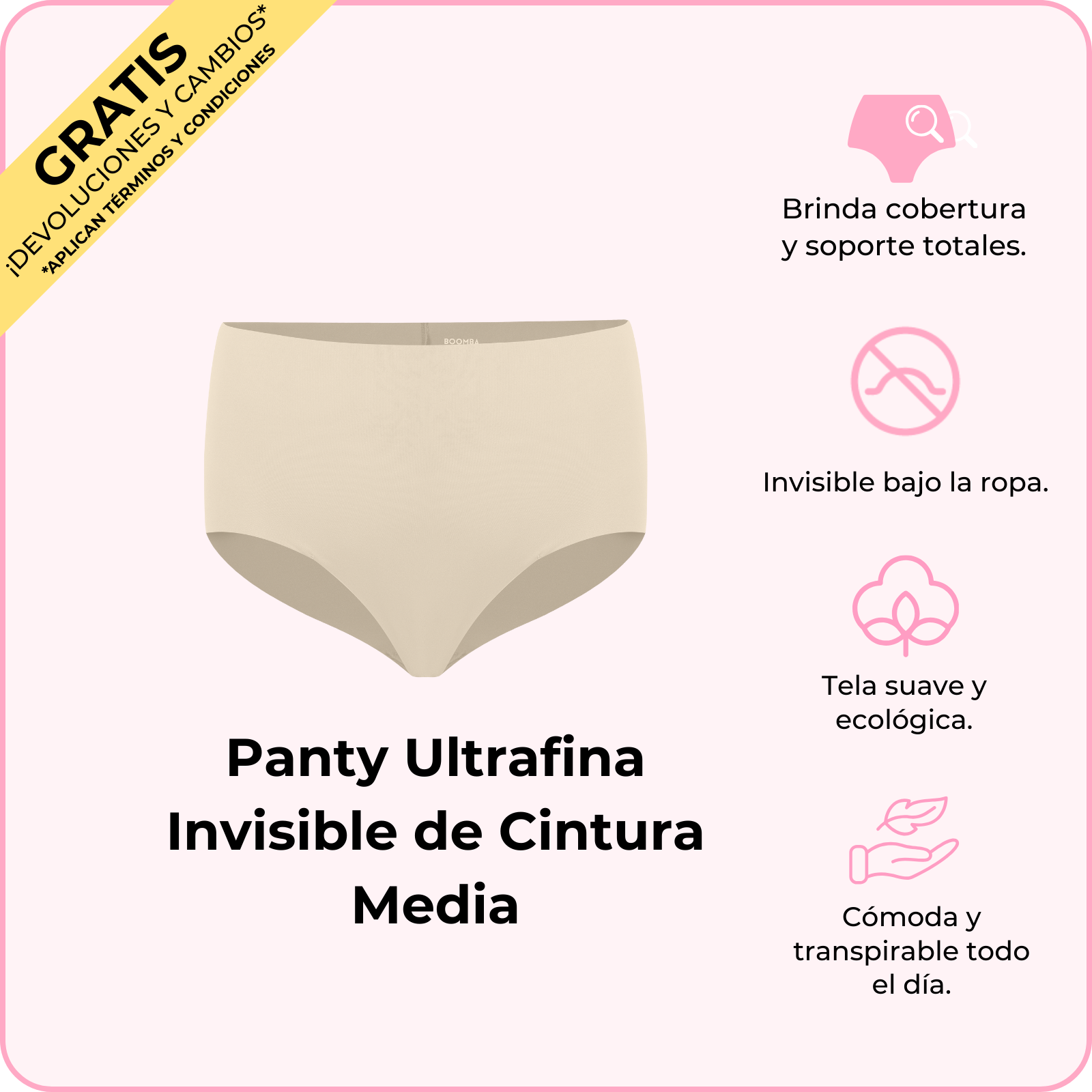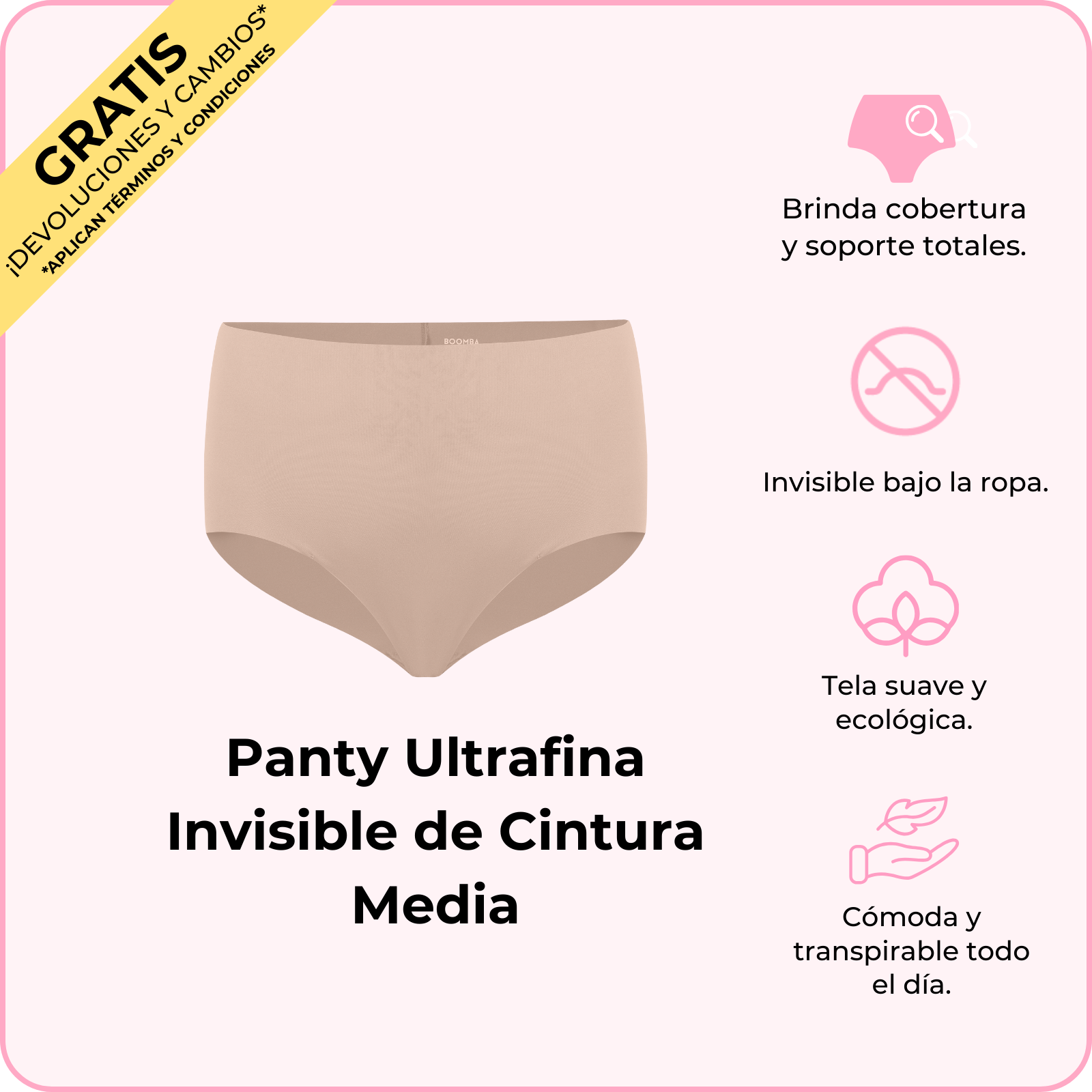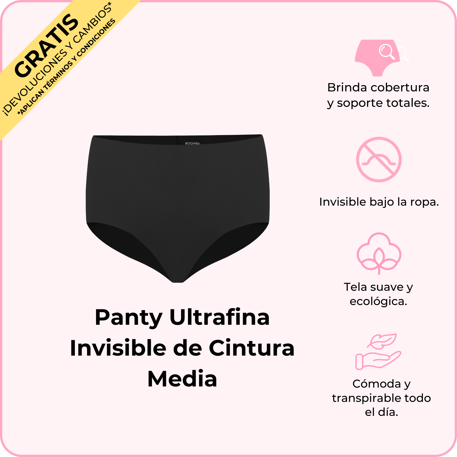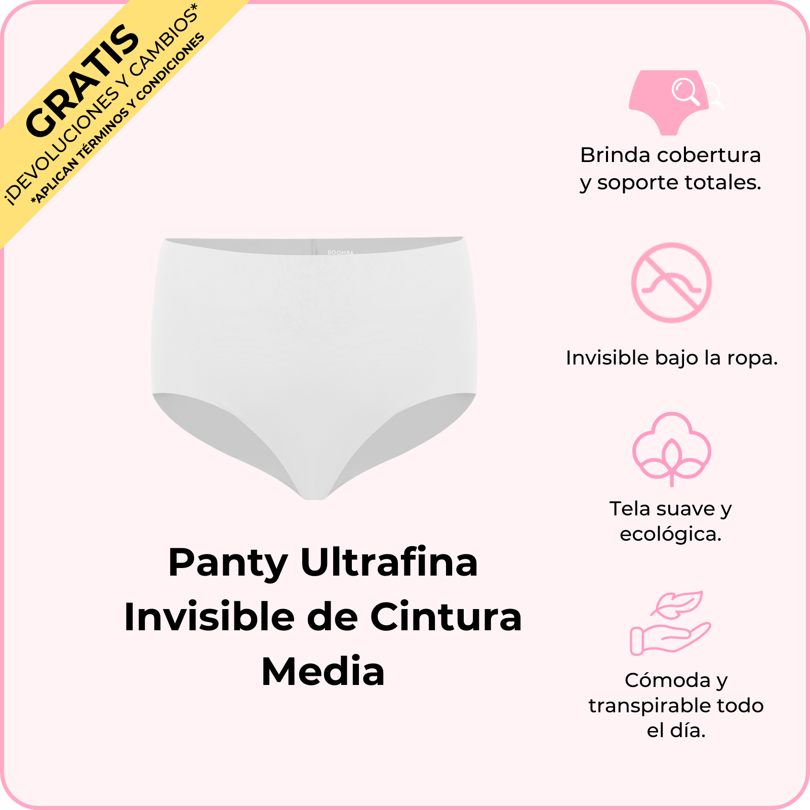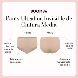 La Panty Ultrafina Invisible de Cintura Media de BOOMBA es como un abrazo para tus caderas: cómoda, bonita y totalmente invisible. Su tela ultrasuave y sin costuras te hará sentir como si no trajeras nada (pero en el mejor de los sentidos). Su corte a cintura media y en la parte trasera te dan una forma favorecedora, así que será tu nueva ropa interior favorita para todo, desde para Netflix hasta para salir de antro. Ponte estas lindas panties y siéntete fabulosa todo el día.