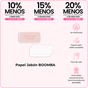 Presentamos el Papel Jabón BOOMBA, formulado especialmente para los productos BOOMBA, ¡es la solución total para mantener tus brasieres frescos y adheribles por más tiempo!