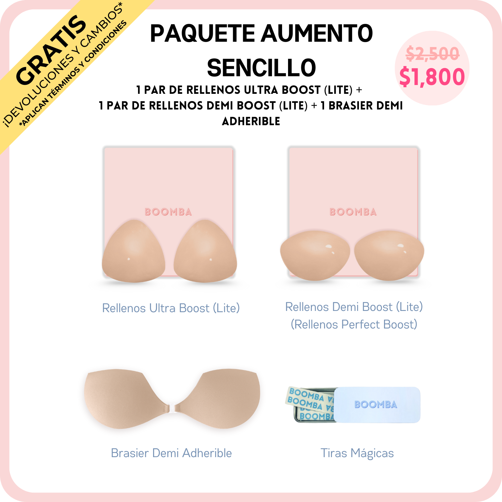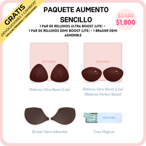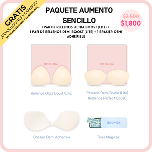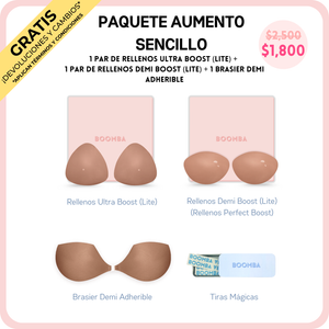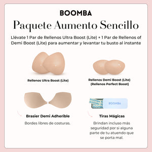 ¿Buscas un aumento de busto que se vea natural? ¡Nuestro Paquete de Aumento Sencillo está hecho para ti! Contiene las versiones más delgadas de nuestros rellenos top en ventas, los Ultra Boost y los Demi Boost. Estas versiones Lite te siguen brindando realce y aumento notables, pero sin el acolchado extra. Aumenta al instante una talla de copa, para un look natural y que puedes usar a diario. Son perfectos para cuando quieres un aumento más discreto, pero con mucha presencia.