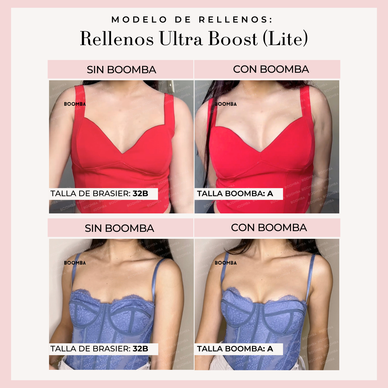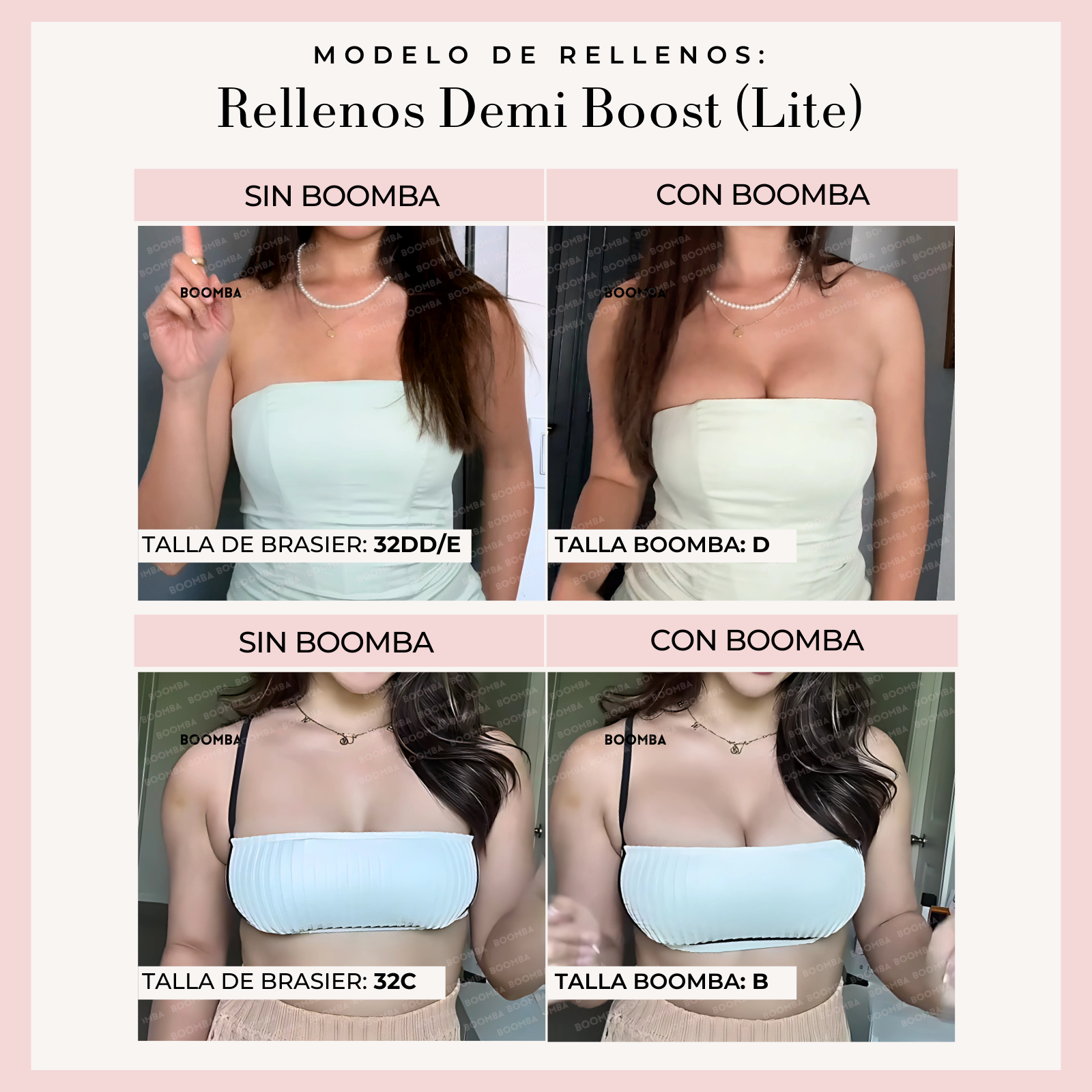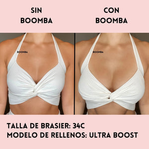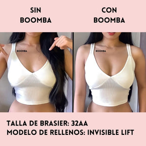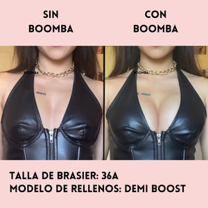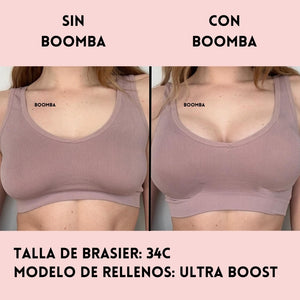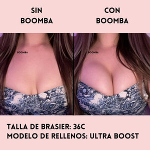 Ten en cuenta que los resultados pueden variar en función del tamaño y la forma del busto. Los resultados serán similares a los de un brasier con push-up doble. Los rellenos acolchados BOOMBA funcionan mejor en pechos naturales.