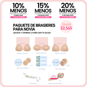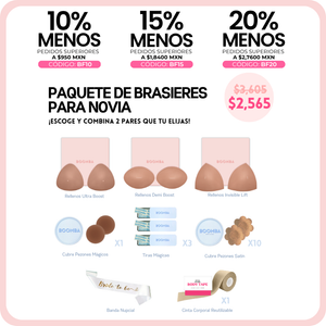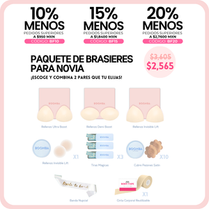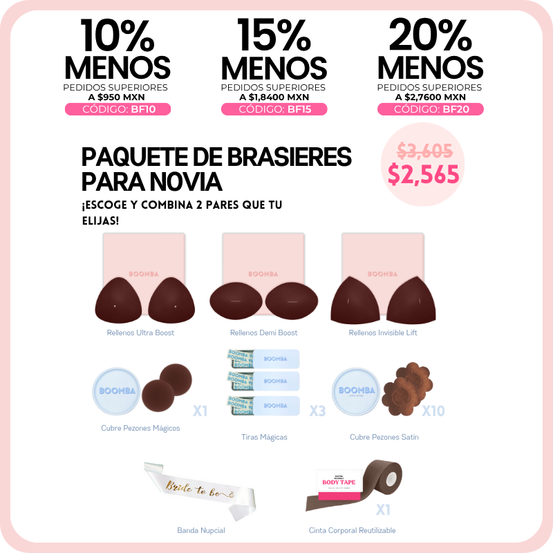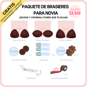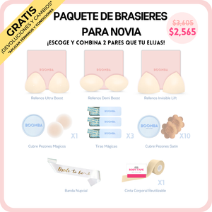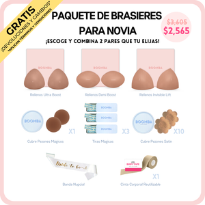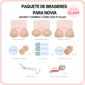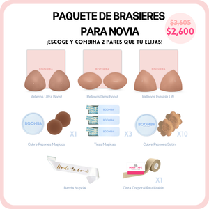 Prepárate al 100 para tu boda con el kit de brasieres para novias de BOOMBA, ¡tiene todo lo que una novia necesita! Desde la prevención de problemitas inesperados con el vestido, hasta perfeccionar cómo luce tu figura en el vestido, con este paquete todo queda cubierto.