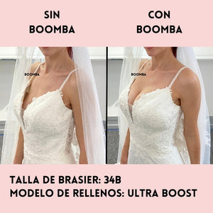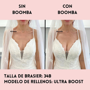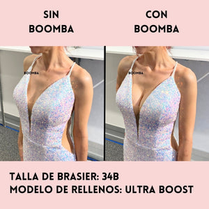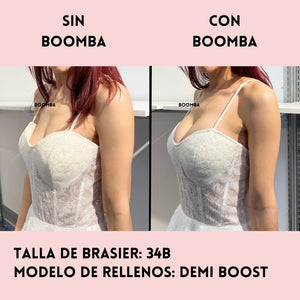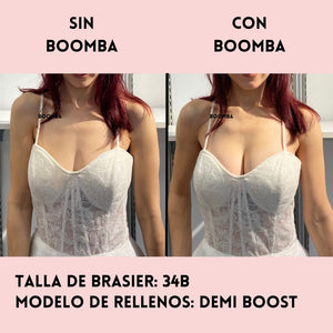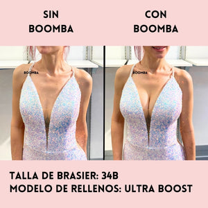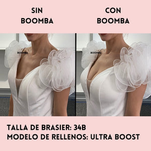 Ten en cuenta que los resultados pueden variar en función del tamaño y la forma del busto. Los resultados serán similares a los de un brasier con push-up doble. Los rellenos acolchados BOOMBA funcionan mejor en pechos naturales.