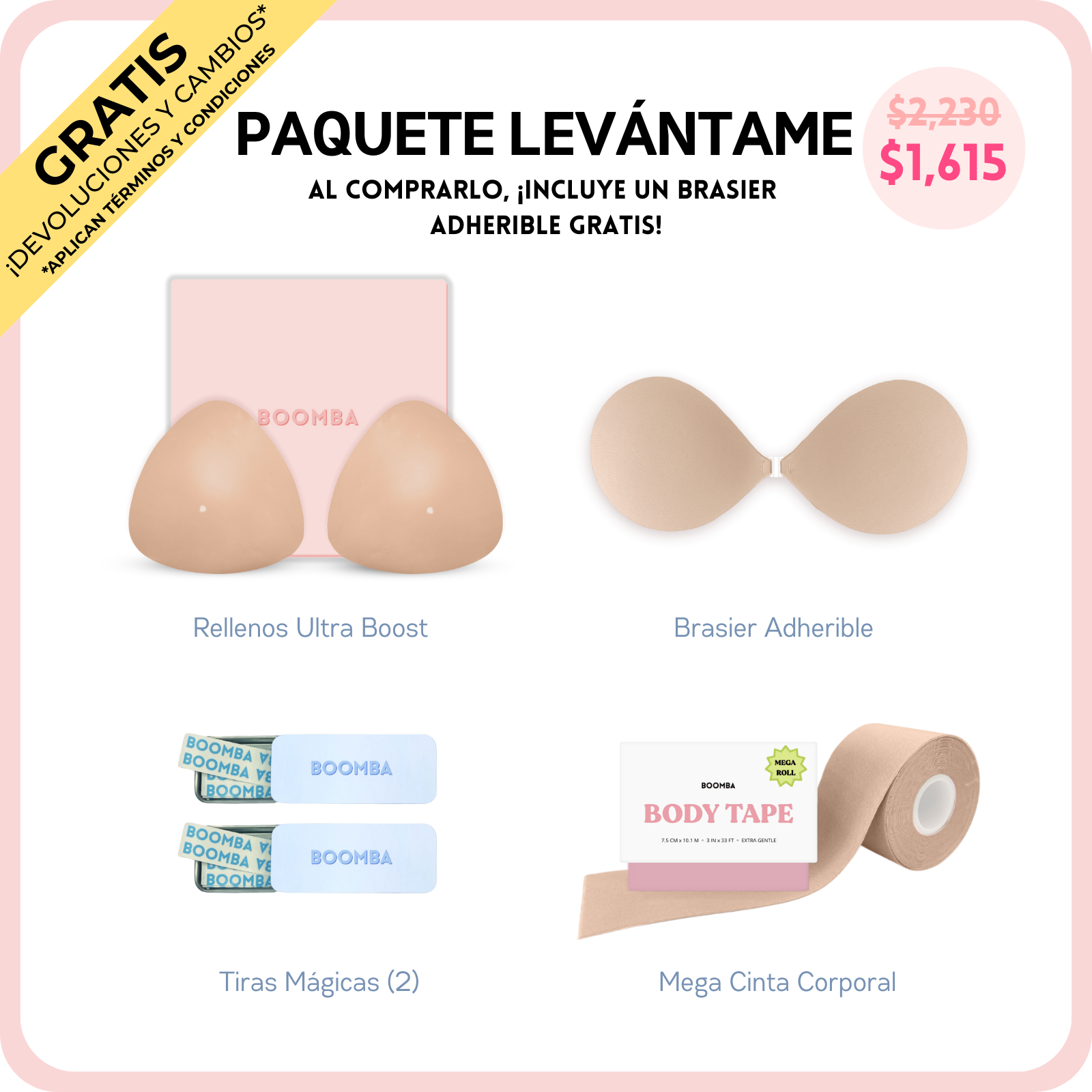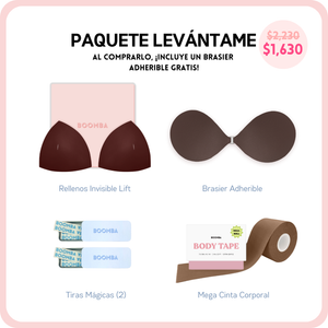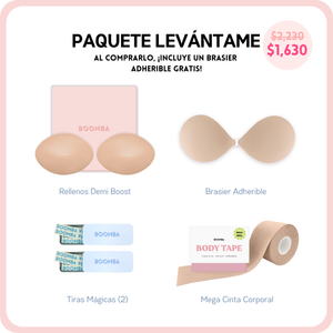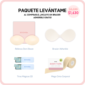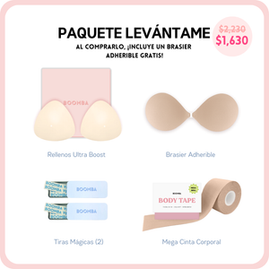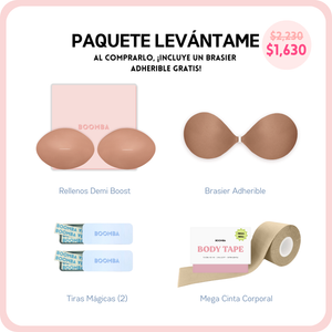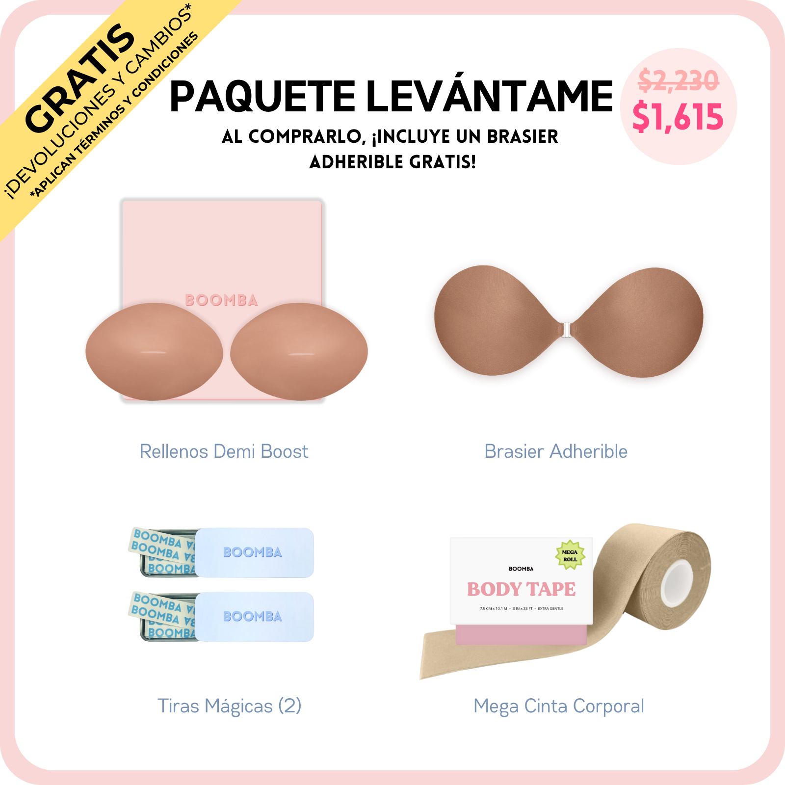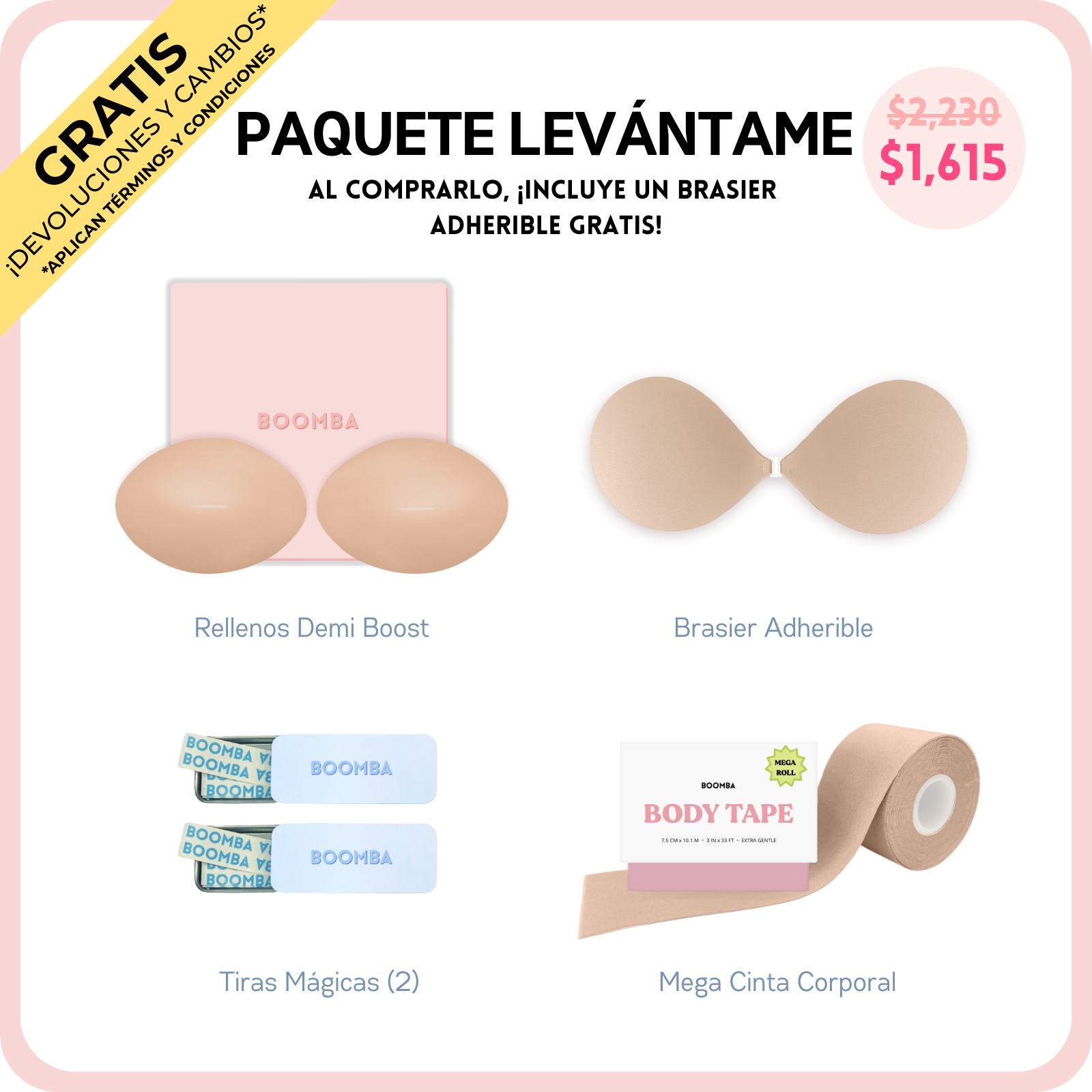 Si buscas un poco más de escote o simplemente deseas lucir tu atuendo con más seguridad, este paquete es perfecto para ti. Incluye 1 par de rellenos, 1 brasier adherible, 2 cajitas de Tiras Mágicas BOOMBA y 1 cinta corporal MEGA. Este paquete te ayudará a conseguir ese realce y volumen natural que buscas.