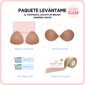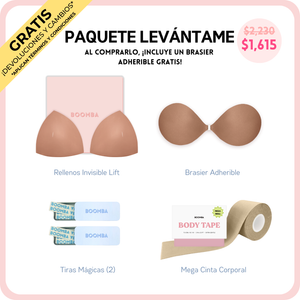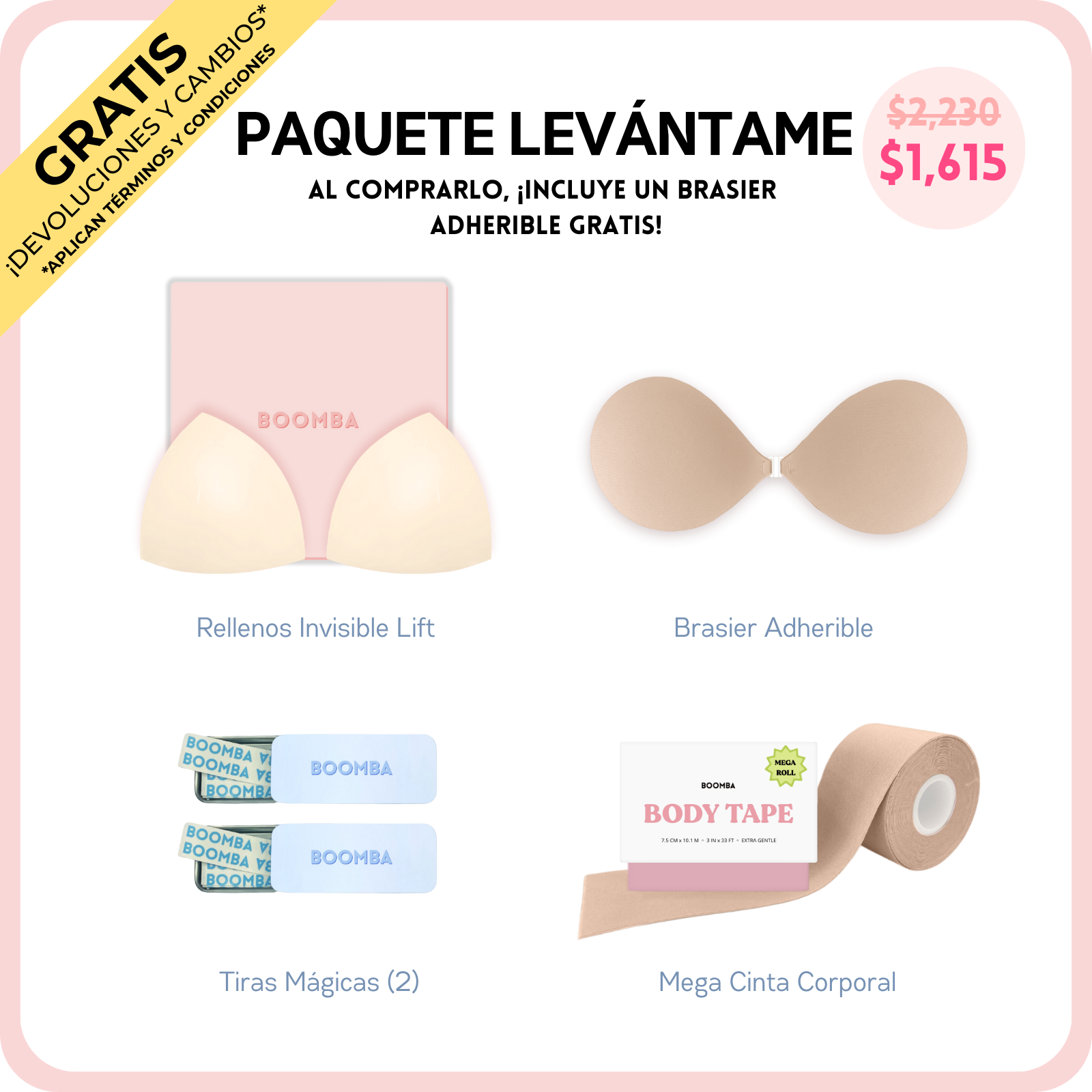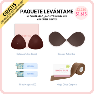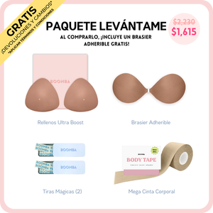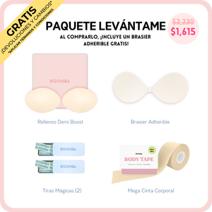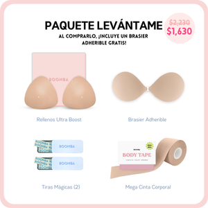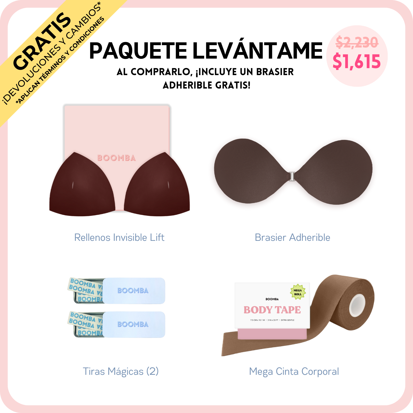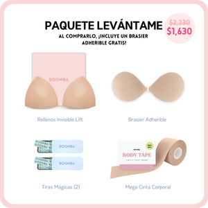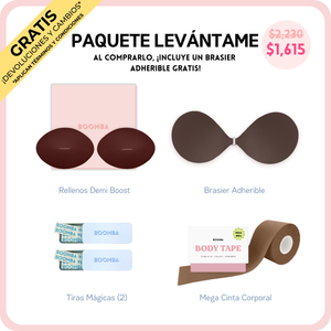 Si buscas un poco más de escote o simplemente deseas lucir tu atuendo con más seguridad, este paquete es perfecto para ti. Incluye 1 par de rellenos, 1 brasier adherible, 2 cajitas de Tiras Mágicas BOOMBA y 1 cinta corporal MEGA. Este paquete te ayudará a conseguir ese realce y volumen natural que buscas.