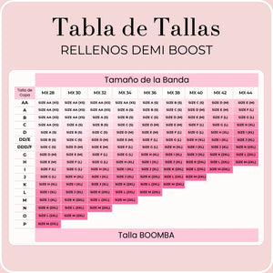Para los rellenos Demi Boost, la talla Extra-Pequeña será enviada para la talla de copa de brasier AA, y la talla Pequeña será enviada para las copas A, B y C. Se enviará talla Mediana para las copas D y E, para las copas F y G enviaremos talla Grande, para las copas H, I y J, enviaremos talla Extra-Grande, y para la talla 2Extra-Grande será enviada para las tallas de copa K, L y M.