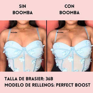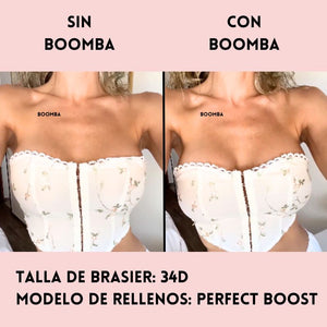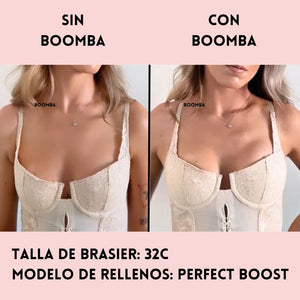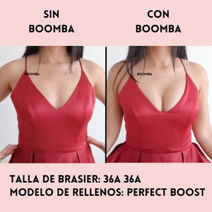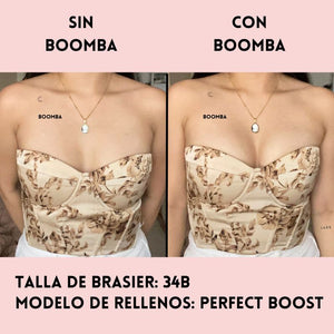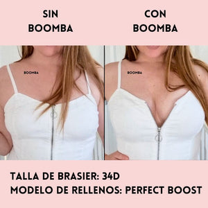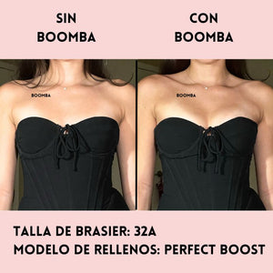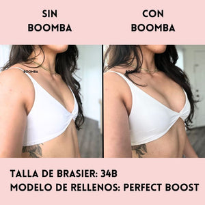 Ten en cuenta que los resultados pueden variar en función del tamaño y la forma del busto. Los resultados serán similares a los de un brasier con push-up doble. Los rellenos acolchados BOOMBA funcionan mejor en pechos naturales.