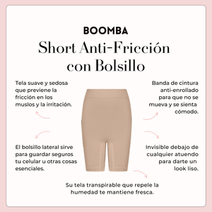 Por fin hay algo que termina con la fricción en los muslos. El Short Anti-Fricción con Bolsillo de BOOMBA combina la comodidad de nuestro diseño original con un estratégico bolsillo lateral que mantiene tus cosas indispensables cerca y seguras.