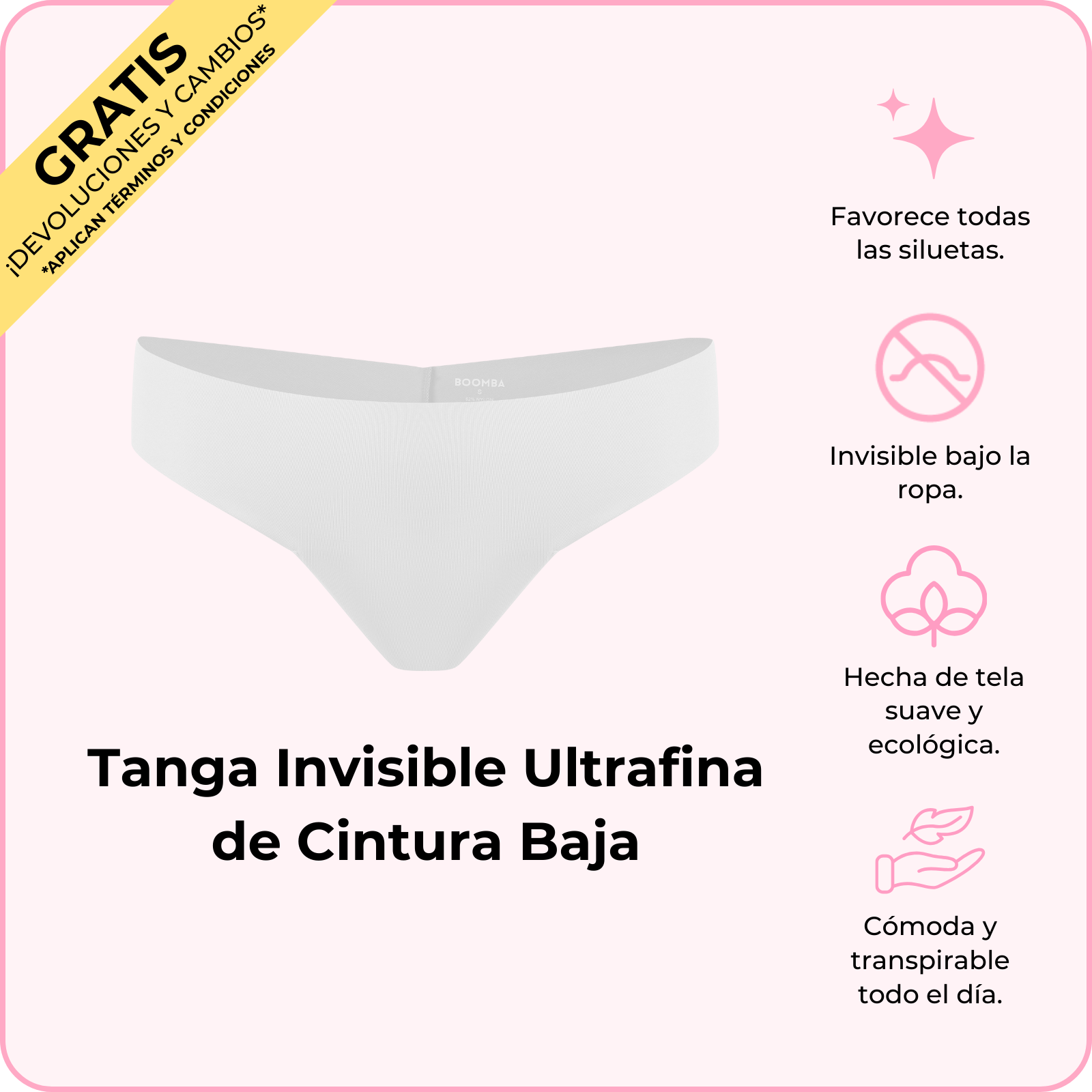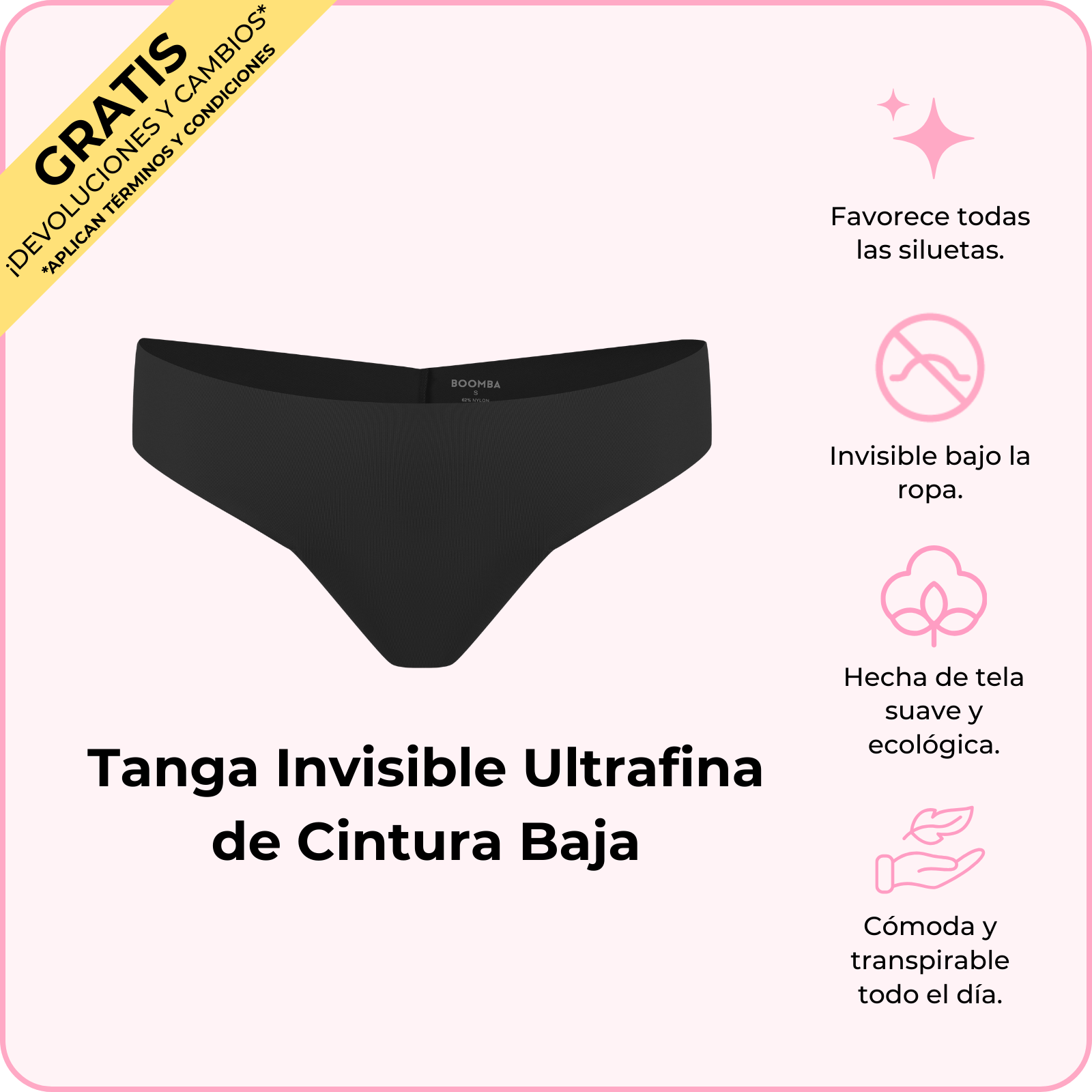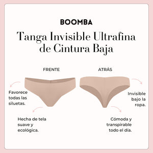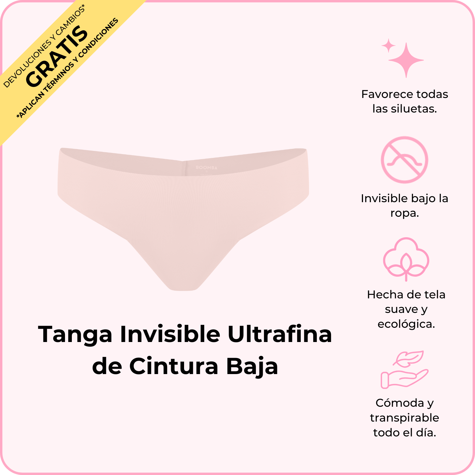 Te presentamos la Tanga Invisible Ultrafina de Cintura Baja de BOOMBA, es tan ligera y sin costuras, así que te olvidarás de que la traes puesta. Con un ajuste bajo y un diseño de tanga, es el secreto para tener comodidad invisible, sin marcas de ropa interior e ideal usarla todo el día. ¿Quién iba a decir que la comodidad podía ser tan atrevida?